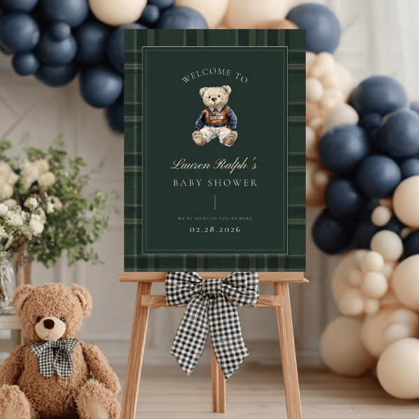 Vintage Teddy Bear Polo Baby Shower Welcome Sign, Polo Baby Shower Plaid Theme, 5x7 and Mobile, Editable Canva Digital Downloads