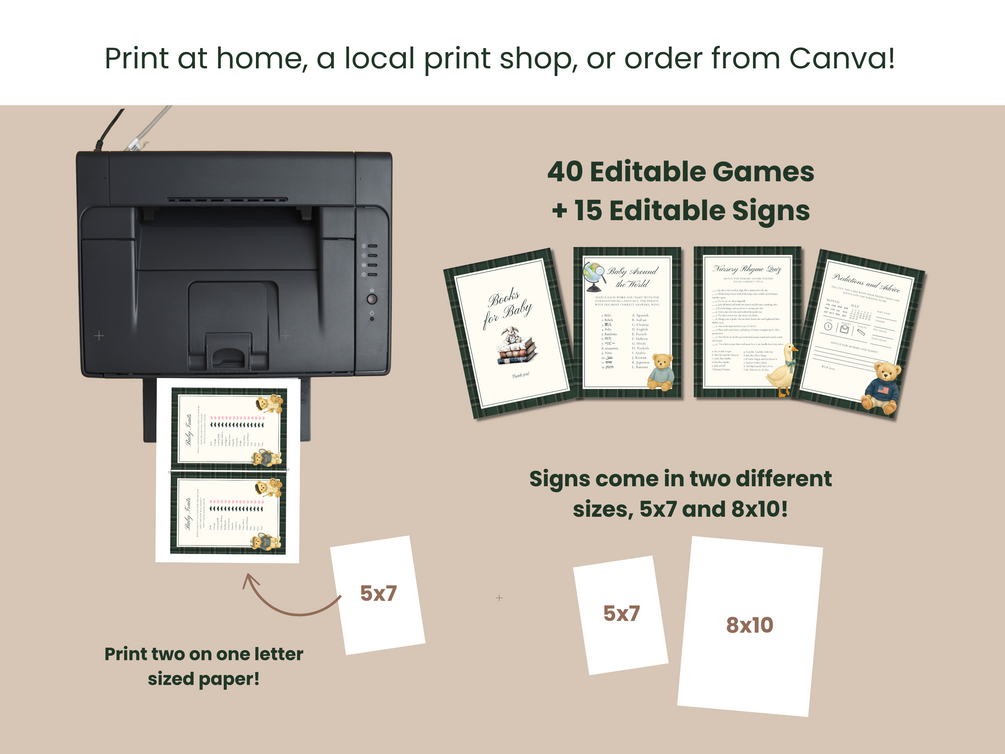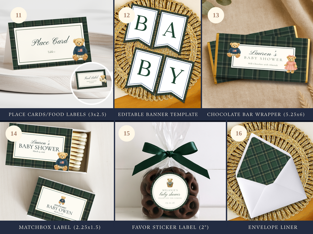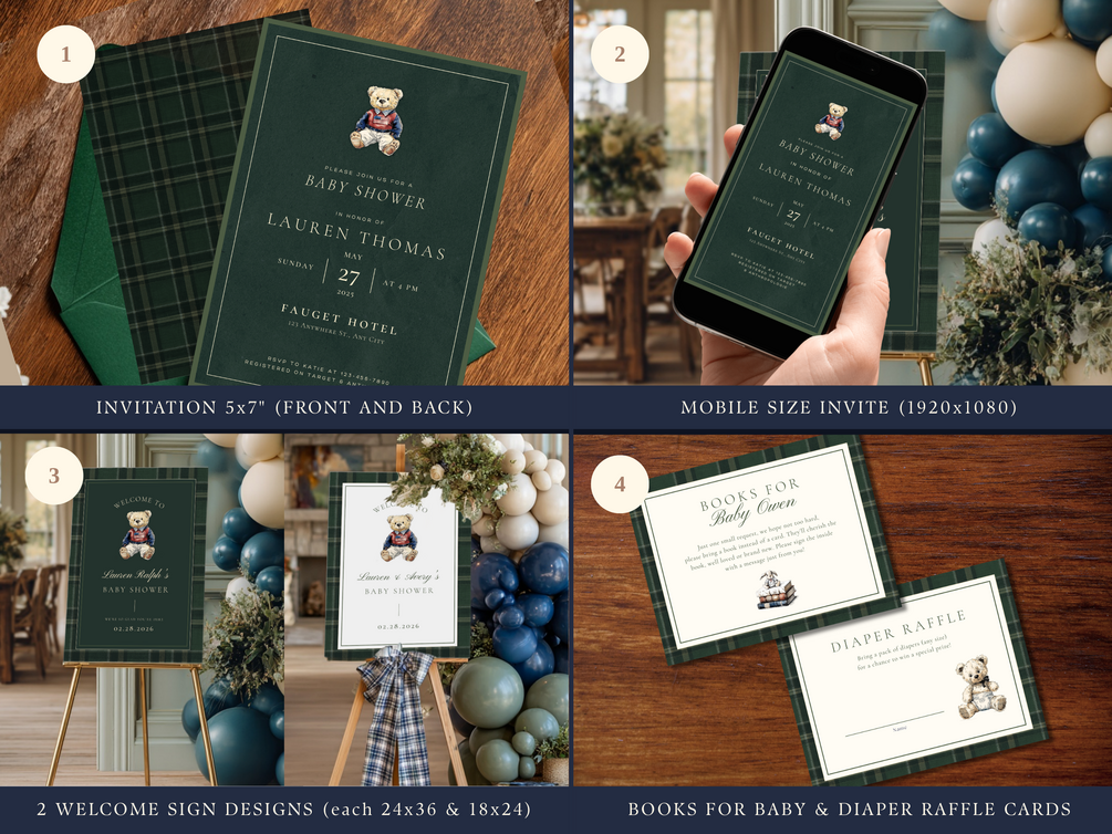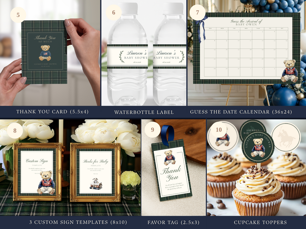Vintage Teddy Bear Polo Baby Shower Ultimate Bundle, Polo Baby Shower Plaid Theme, Games and Signs Bundle, Editable Canva Digital Downloads